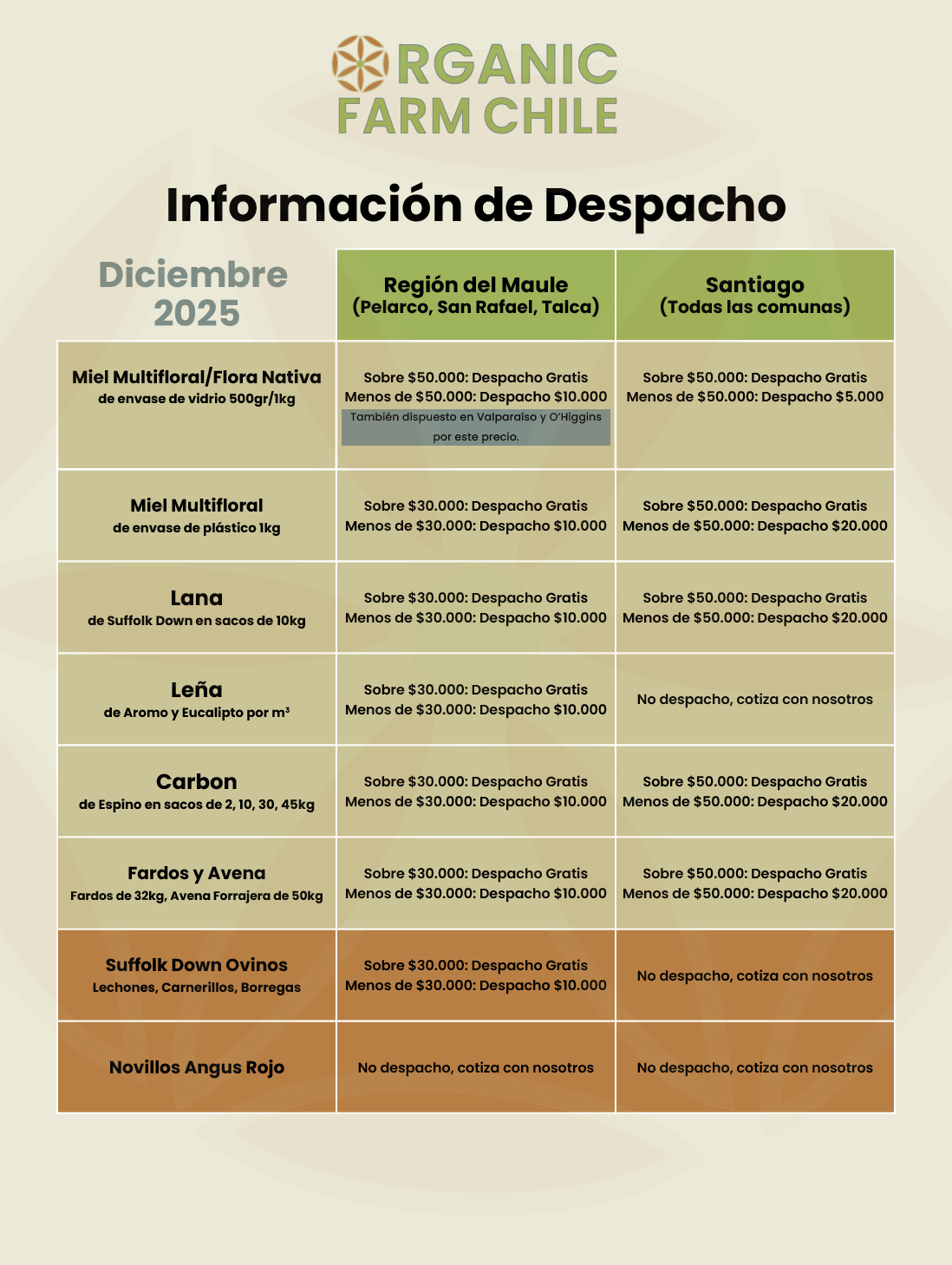 - Organic Farm Chile no asume costos ni responsabilidad por el transporte gestionado por terceros, una vez entregado el producto en el punto de retiro acordado.